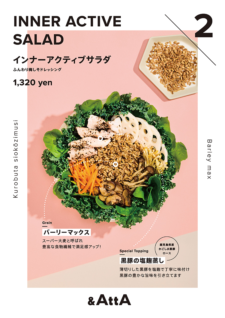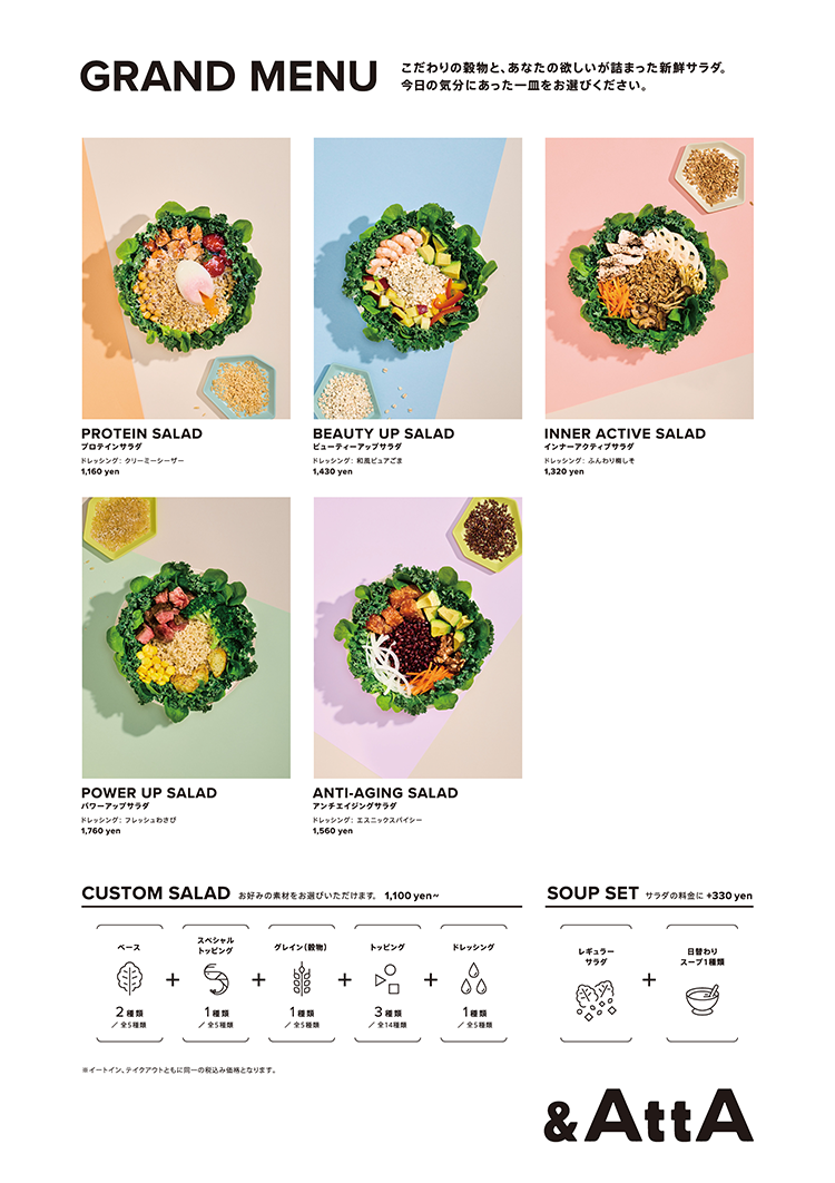 グレインズサラダ専門店&AttAのロゴ・紙ツールなどのアートディレクション、デザインを担当しました。